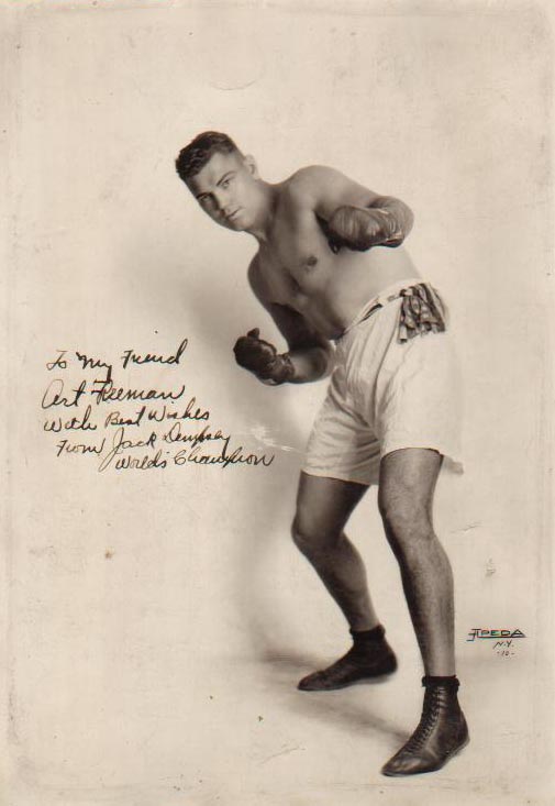 Signed and inscribed in black fountain pen ink while "world's heavyweight champ"... Measures 7 x 10"... Some light soiling as seen in scan... A small ding to the right of his left thigh, otherwise fine condition... An early signature and very clear image of a young Jack Dempsey |