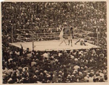 "The Million Dollar Gate" A pair of vintage photos from the Dempsey-Carpentier fight (7-2-21)... Photo on left labeled "Dempsey in distress-second round" and photo on right "first knockdown-fourth round"... Both photos have "Underwood & Underwood" raised stamp at lower right corner and measure 7 x 9"... Some creasing to corners visible in scan... Some publication touch-ups... Overall condition is fine
