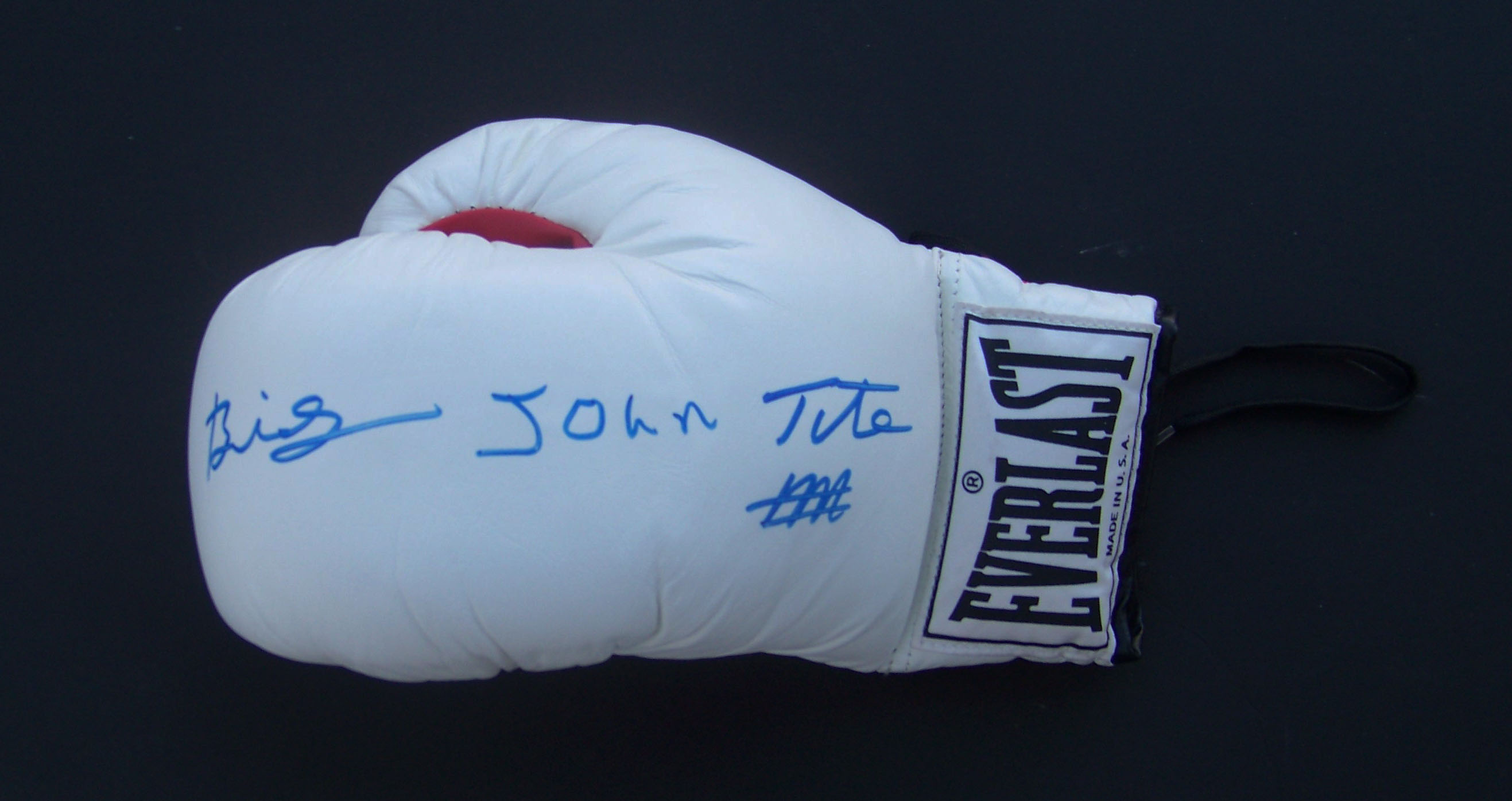 Former WBA heavyweight champion "Big" John Tate has boldly signed this white Everlast boxing glove in blue sharpie marker... A perfect autograph and rare on a glove!!