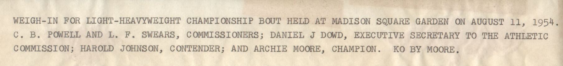 This vintage-original photo shows champion Archie Moore and challenger Harold Johnson weighing in for their light-heavyweight championship bout which is to be held at Madison Square Garden later the same day.... Moore would TKO Johnson in round 14 to retain his title... A very clear oversized image!!